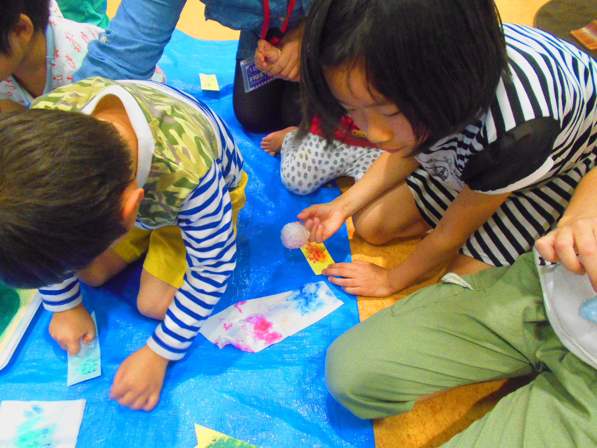 5月2日(月)は梱包材のプチプチにインクを付けてポンポン模様をつけました。